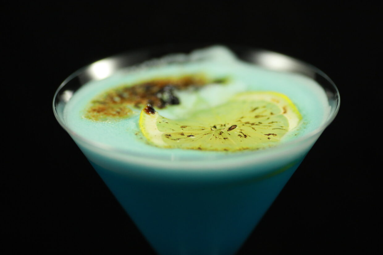 Skaka först ordentligt utan is och sedan med is. Sila. Vi valde att bränna äggvitan på toppen.